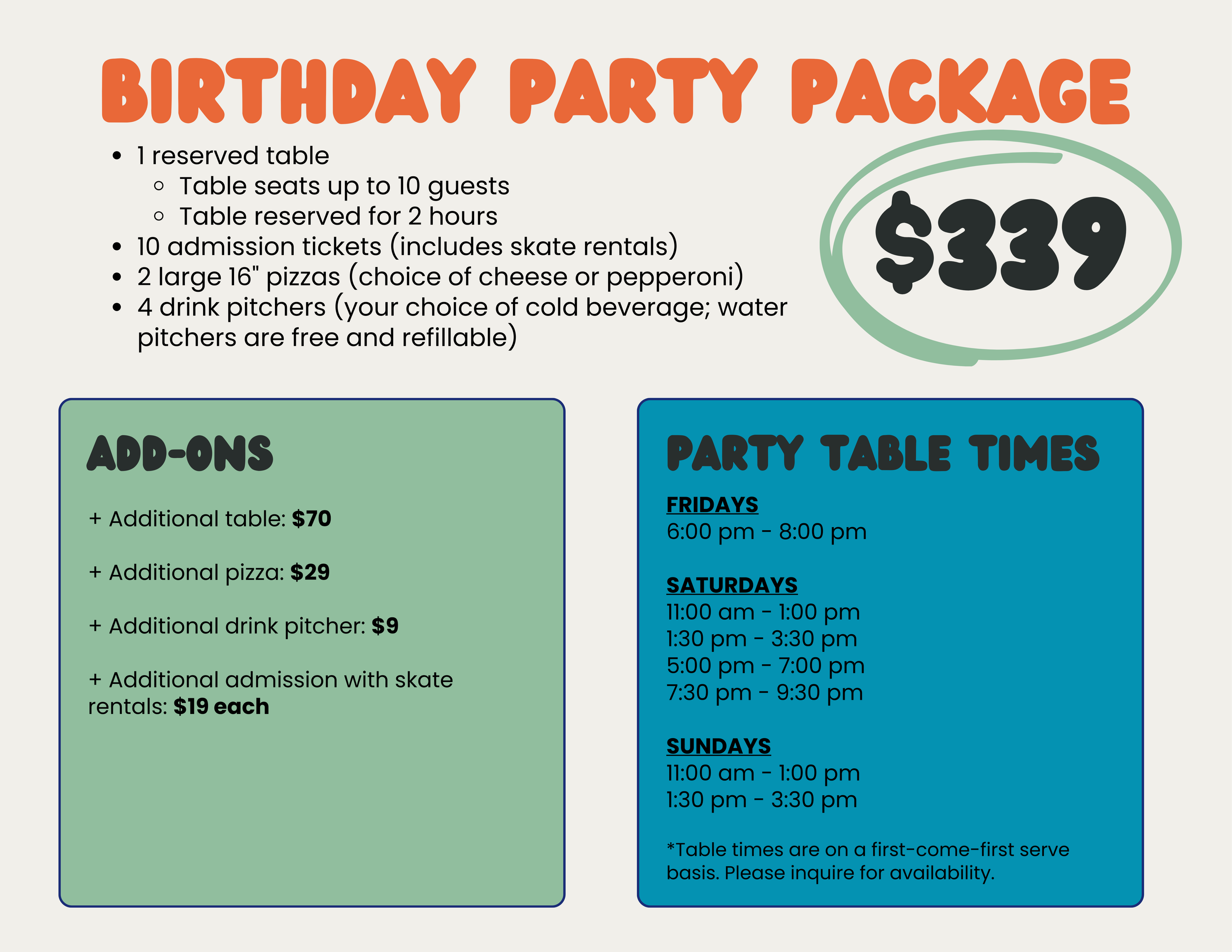 If you need three (3) or more tables, a deposit is required. Deposits can be paid over the phone or in person in the rink’s Pro Shop.